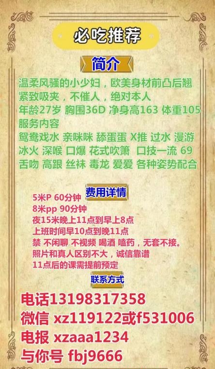 没有踩坑,二百块钱快餐太值得了,性价比真的很高。一进门的话就问喝不喝水,然后的话就去洗澡。我选的一个快餐又加一个套餐,套餐一起洗澡,帮你亲自去洗,洗了之后我们就躺到床上,然后后就进行胸推,漫游,特别是这个深喉,哎呀,太爽,,舔的全身都是酥酥麻麻的,太爽了。这个胸哈,是真有手感,。软软的。我是一个胸控,但是都没来得及及时间去摸。然后水也很多,很配合,不会敷衍了事。有兄弟们可以去试一下,性价比真的很高了。身材bbw。就是皮肤很滑,,不踩坑,兄弟们可以去冲,服务没得说,酥酥麻麻的,薇朩QQ加不上的,直接打电话联系老师,老师本人自己开课,靠谱