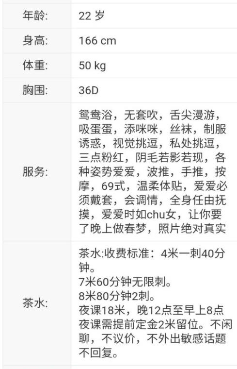 没有踩坑,二百块钱快餐太值得了,性价比真的很高。一进门的话就问喝不喝水,然后的话就去洗澡。我选的一个快餐又加一个套餐,套餐一起洗澡,帮你亲自去洗,洗了之后我们就躺到床上,然后后就进行胸推,漫游,特别是这个深喉,哎呀,太爽,,舔的全身都是酥酥麻麻的,太爽了。这个胸哈,是真有手感,。软软的。我是一个胸控,但是都没来得及及时间去摸。然后水也很多,很配合,不会敷衍了事。有兄弟们可以去试一下,性价比真的很高了。身材bbw。就是皮肤很滑,,不踩坑,兄弟们可以去冲,服务没得说,酥酥麻麻的,薇朩QQ加不上的,直接打电话联系老师,老师本人自己开课,靠谱