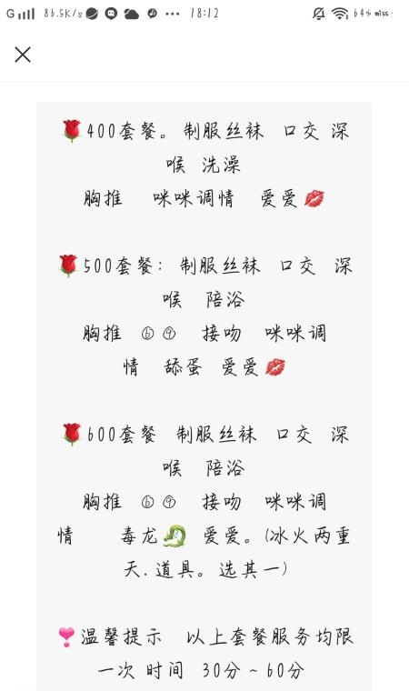 没有踩坑,二百块钱快餐太值得了,性价比真的很高。一进门的话就问喝不喝水,然后的话就去洗澡。我选的一个快餐又加一个套餐,套餐一起洗澡,帮你亲自去洗,洗了之后我们就躺到床上,然后后就进行胸推,漫游,特别是这个深喉,哎呀,太爽,,舔的全身都是酥酥麻麻的,太爽了。这个胸哈,是真有手感,。软软的。我是一个胸控,但是都没来得及及时间去摸。然后水也很多,很配合,不会敷衍了事。有兄弟们可以去试一下,性价比真的很高了。身材bbw。就是皮肤很滑,,不踩坑,兄弟们可以去冲,服务没得说,酥酥麻麻的,薇朩QQ加不上的,直接打电话联系老师,老师本人自己开课,靠谱