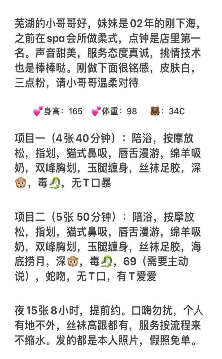 没有踩坑,二百块钱快餐太值得了,性价比真的很高。一进门的话就问喝不喝水,然后的话就去洗澡。我选的一个快餐又加一个套餐,套餐一起洗澡,帮你亲自去洗,洗了之后我们就躺到床上,然后后就进行胸推,漫游,特别是这个深喉,哎呀,太爽,,舔的全身都是酥酥麻麻的,太爽了。这个胸哈,是真有手感,。软软的。我是一个胸控,但是都没来得及及时间去摸。然后水也很多,很配合,不会敷衍了事。有兄弟们可以去试一下,性价比真的很高了。身材bbw。就是皮肤很滑,,不踩坑,兄弟们可以去冲,服务没得说,酥酥麻麻的,薇朩QQ加不上的,直接打电话联系老师,老师本人自己开课,靠谱