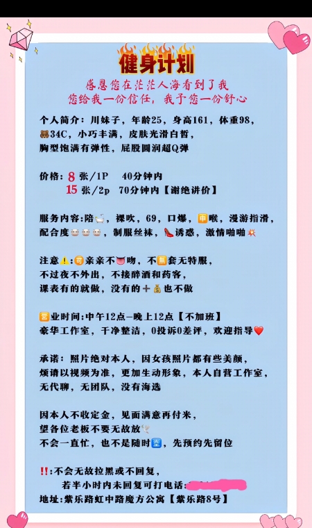 没有踩坑,二百块钱快餐太值得了,性价比真的很高。一进门的话就问喝不喝水,然后的话就去洗澡。我选的一个快餐又加一个套餐,套餐一起洗澡,帮你亲自去洗,洗了之后我们就躺到床上,然后后就进行胸推,漫游,特别是这个深喉,哎呀,太爽,,舔的全身都是酥酥麻麻的,太爽了。这个胸哈,是真有手感,。软软的。我是一个胸控,但是都没来得及及时间去摸。然后水也很多,很配合,不会敷衍了事。有兄弟们可以去试一下,性价比真的很高了。身材bbw。就是皮肤很滑,,不踩坑,兄弟们可以去冲,服务没得说,酥酥麻麻的,薇朩QQ加不上的,直接打电话联系老师,老师本人自己开课,靠谱