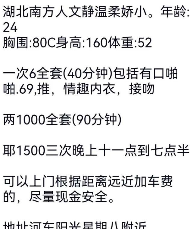 没有踩坑,二百块钱快餐太值得了,性价比真的很高。一进门的话就问喝不喝水,然后的话就去洗澡。我选的一个快餐又加一个套餐,套餐一起洗澡,帮你亲自去洗,洗了之后我们就躺到床上,然后后就进行胸推,漫游,特别是这个深喉,哎呀,太爽,,舔的全身都是酥酥麻麻的,太爽了。这个胸哈,是真有手感,。软软的。我是一个胸控,但是都没来得及及时间去摸。然后水也很多,很配合,不会敷衍了事。有兄弟们可以去试一下,性价比真的很高了。身材bbw。就是皮肤很滑,,不踩坑,兄弟们可以去冲,服务没得说,酥酥麻麻的,薇朩QQ加不上的,直接打电话联系老师,老师本人自己开课,靠谱