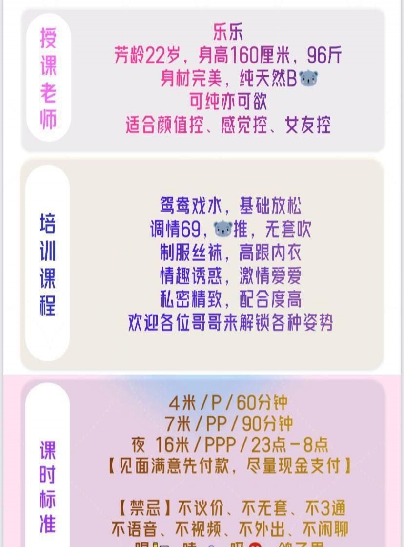 没有踩坑,二百块钱快餐太值得了,性价比真的很高。一进门的话就问喝不喝水,然后的话就去洗澡。我选的一个快餐又加一个套餐,套餐一起洗澡,帮你亲自去洗,洗了之后我们就躺到床上,然后后就进行胸推,漫游,特别是这个深喉,哎呀,太爽,,舔的全身都是酥酥麻麻的,太爽了。这个胸哈,是真有手感,。软软的。我是一个胸控,但是都没来得及及时间去摸。然后水也很多,很配合,不会敷衍了事。有兄弟们可以去试一下,性价比真的很高了。身材bbw。就是皮肤很滑,,不踩坑,兄弟们可以去冲,服务没得说,酥酥麻麻的,薇朩QQ加不上的,直接打电话联系老师,老师本人自己开课,靠谱
