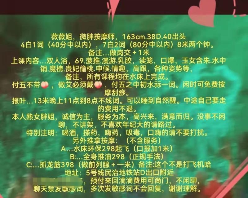 没有踩坑,二百块钱快餐太值得了,性价比真的很高。一进门的话就问喝不喝水,然后的话就去洗澡。我选的一个快餐又加一个套餐,套餐一起洗澡,帮你亲自去洗,洗了之后我们就躺到床上,然后后就进行胸推,漫游,特别是这个深喉,哎呀,太爽,,舔的全身都是酥酥麻麻的,太爽了。这个胸哈,是真有手感,。软软的。我是一个胸控,但是都没来得及及时间去摸。然后水也很多,很配合,不会敷衍了事。有兄弟们可以去试一下,性价比真的很高了。身材bbw。就是皮肤很滑,,不踩坑,兄弟们可以去冲,服务没得说,酥酥麻麻的,薇朩QQ加不上的,直接打电话联系老师,老师本人自己开课,靠谱