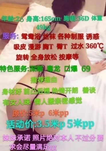 没有踩坑,二百块钱快餐太值得了,性价比真的很高。一进门的话就问喝不喝水,然后的话就去洗澡。我选的一个快餐又加一个套餐,套餐一起洗澡,帮你亲自去洗,洗了之后我们就躺到床上,然后后就进行胸推,漫游,特别是这个深喉,哎呀,太爽,,舔的全身都是酥酥麻麻的,太爽了。这个胸哈,是真有手感,。软软的。我是一个胸控,但是都没来得及及时间去摸。然后水也很多,很配合,不会敷衍了事。有兄弟们可以去试一下,性价比真的很高了。身材bbw。就是皮肤很滑,,不踩坑,兄弟们可以去冲,服务没得说,酥酥麻麻的,薇朩QQ加不上的,直接打电话联系老师,老师本人自己开课,靠谱