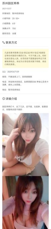 妹子之前在工业园区,现在搬到相城了,正好今天有时间联系一下,妹子也有时间。妹子属于丰满型,性格温柔,基本有求必应,一对大白兔胸推是我的最爱,隔段时间我都会找下她。服务整体不错,适合怡情发泄。