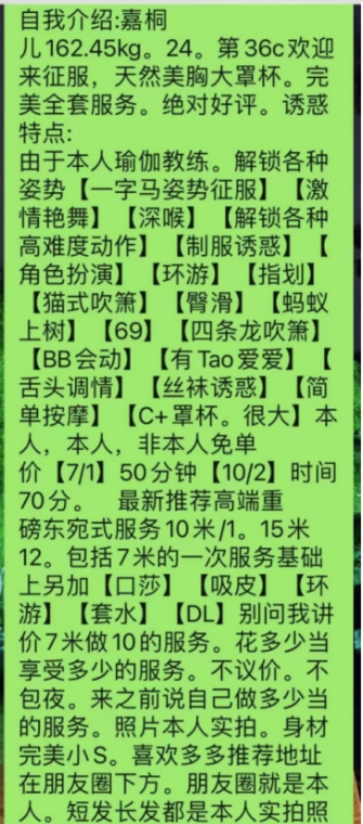 没有踩坑,二百块钱快餐太值得了,性价比真的很高。一进门的话就问喝不喝水,然后的话就去洗澡。我选的一个快餐又加一个套餐,套餐一起洗澡,帮你亲自去洗,洗了之后我们就躺到床上,然后后就进行胸推,漫游,特别是这个深喉,哎呀,太爽,,舔的全身都是酥酥麻麻的,太爽了。这个胸哈,是真有手感,。软软的。我是一个胸控,但是都没来得及及时间去摸。然后水也很多,很配合,不会敷衍了事。有兄弟们可以去试一下,性价比真的很高了。身材bbw。就是皮肤很滑,,不踩坑,兄弟们可以去冲,服务没得说,酥酥麻麻的,薇朩QQ加不上的,直接打电话联系老师,老师本人自己开课,靠谱
