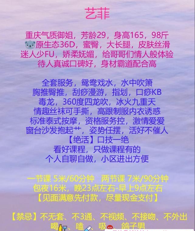 没有踩坑,二百块钱快餐太值得了,性价比真的很高。一进门的话就问喝不喝水,然后的话就去洗澡。我选的一个快餐又加一个套餐,套餐一起洗澡,帮你亲自去洗,洗了之后我们就躺到床上,然后后就进行胸推,漫游,特别是这个深喉,哎呀,太爽,,舔的全身都是酥酥麻麻的,太爽了。这个胸哈,是真有手感,。软软的。我是一个胸控,但是都没来得及及时间去摸。然后水也很多,很配合,不会敷衍了事。有兄弟们可以去试一下,性价比真的很高了。身材bbw。就是皮肤很滑,,不踩坑,兄弟们可以去冲,服务没得说,酥酥麻麻的,薇朩QQ加不上的,直接打电话联系老师,老师本人自己开课,靠谱