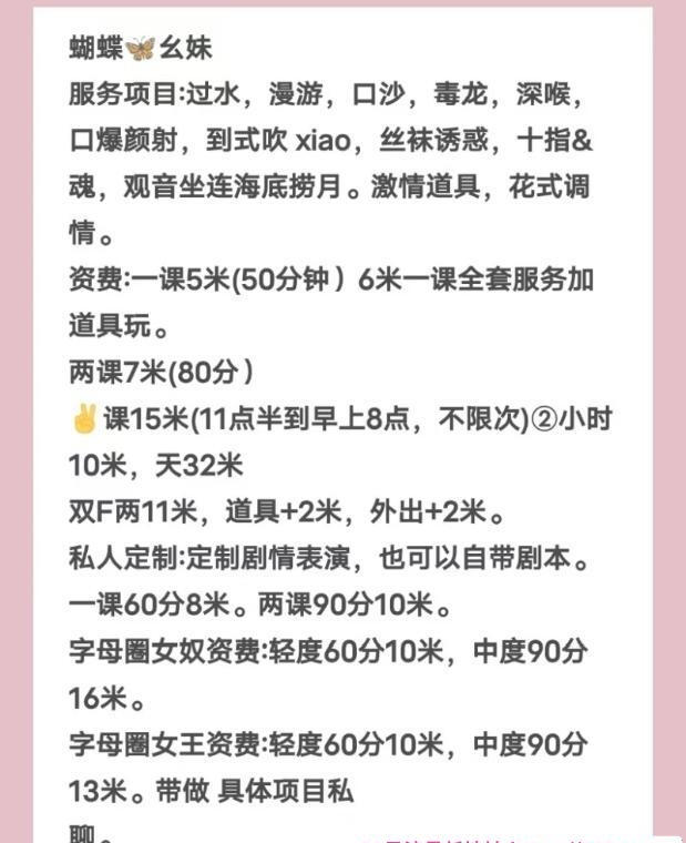 没有踩坑,二百块钱快餐太值得了,性价比真的很高。一进门的话就问喝不喝水,然后的话就去洗澡。我选的一个快餐又加一个套餐,套餐一起洗澡,帮你亲自去洗,洗了之后我们就躺到床上,然后后就进行胸推,漫游,特别是这个深喉,哎呀,太爽,,舔的全身都是酥酥麻麻的,太爽了。这个胸哈,是真有手感,。软软的。我是一个胸控,但是都没来得及及时间去摸。然后水也很多,很配合,不会敷衍了事。有兄弟们可以去试一下,性价比真的很高了。身材bbw。就是皮肤很滑,,不踩坑,兄弟们可以去冲,服务没得说,酥酥麻麻的,薇朩QQ加不上的,直接打电话联系老师,老师本人自己开课,靠谱