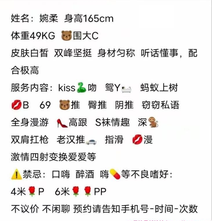 没有踩坑,二百块钱快餐太值得了,性价比真的很高。一进门的话就问喝不喝水,然后的话就去洗澡。我选的一个快餐又加一个套餐,套餐一起洗澡,帮你亲自去洗,洗了之后我们就躺到床上,然后后就进行胸推,漫游,特别是这个深喉,哎呀,太爽,,舔的全身都是酥酥麻麻的,太爽了。这个胸哈,是真有手感,。软软的。我是一个胸控,但是都没来得及及时间去摸。然后水也很多,很配合,不会敷衍了事。有兄弟们可以去试一下,性价比真的很高了。身材bbw。就是皮肤很滑,,不踩坑,兄弟们可以去冲,服务没得说,酥酥麻麻的,薇朩QQ加不上的,直接打电话联系老师,老师本人自己开课,靠谱