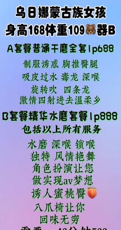 蒙古族女孩,人照合一,气质御姐,个子高,皮肤白。颜值中上等,上海会所以前做莞式服务培训师的,所以服务技能拉满,具体服务项目看课表。