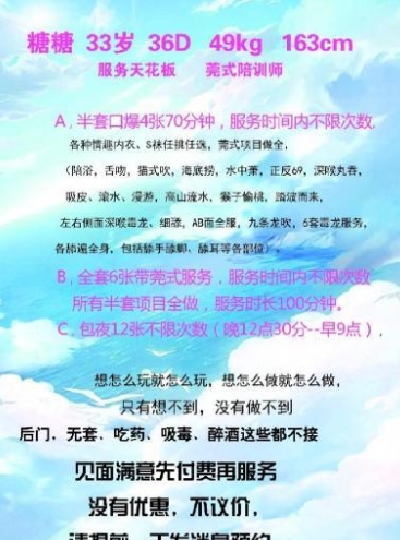 没有踩坑,二百块钱快餐太值得了,性价比真的很高。一进门的话就问喝不喝水,然后的话就去洗澡。我选的一个快餐又加一个套餐,套餐一起洗澡,帮你亲自去洗,洗了之后我们就躺到床上,然后后就进行胸推,漫游,特别是这个深喉,哎呀,太爽,,舔的全身都是酥酥麻麻的,太爽了。这个胸哈,是真有手感,。软软的。我是一个胸控,但是都没来得及及时间去摸。然后水也很多,很配合,不会敷衍了事。有兄弟们可以去试一下,性价比真的很高了。身材bbw。就是皮肤很滑,,不踩坑,兄弟们可以去冲,服务没得说,酥酥麻麻的,薇朩QQ加不上的,直接打电话联系老师,老师本人自己开课,靠谱