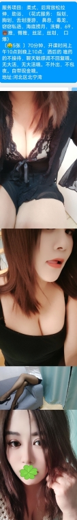 朋友推荐的,说小姐姐人挺好,做活也听细的,今天空,约了时间过去了,发了位置,指挥上楼,屋子不大,收拾的倒挺干净的。太多的我也不会说,总之体验感不错,很释放解压。小姐本人好像比照片上看着瘦哦。