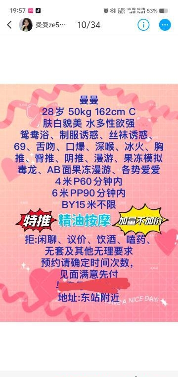 在群里看了各位天哥等大哥说曼曼按摩好,服务好,够骚够提劲,啥也别说了,约了时间直接冲,进门就抱着我开始啃,提劲,还有镜子可以用,视觉盛宴,按摩是真的给力啊,手法确实专业,4/6买不了吃亏买不了上当。不多说了,继续享受中场按摩。等下再来一炮撤退。