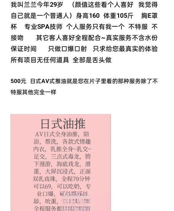 没有踩坑,二百块钱快餐太值得了,性价比真的很高。一进门的话就问喝不喝水,然后的话就去洗澡。我选的一个快餐又加一个套餐,套餐一起洗澡,帮你亲自去洗,洗了之后我们就躺到床上,然后后就进行胸推,漫游,特别是这个深喉,哎呀,太爽,,舔的全身都是酥酥麻麻的,太爽了。这个胸哈,是真有手感,。软软的。我是一个胸控,但是都没来得及及时间去摸。然后水也很多,很配合,不会敷衍了事。有兄弟们可以去试一下,性价比真的很高了。身材bbw。就是皮肤很滑,,不踩坑,兄弟们可以去冲,服务没得说,酥酥麻麻的,薇朩QQ加不上的,直接打电话联系老师,老师本人自己开课,靠谱