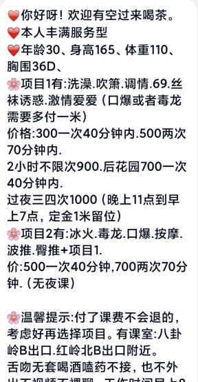 没有踩坑,二百块钱快餐太值得了,性价比真的很高。一进门的话就问喝不喝水,然后的话就去洗澡。我选的一个快餐又加一个套餐,套餐一起洗澡,帮你亲自去洗,洗了之后我们就躺到床上,然后后就进行胸推,漫游,特别是这个深喉,哎呀,太爽,,舔的全身都是酥酥麻麻的,太爽了。这个胸哈,是真有手感,。软软的。我是一个胸控,但是都没来得及及时间去摸。然后水也很多,很配合,不会敷衍了事。有兄弟们可以去试一下,性价比真的很高了。身材bbw。就是皮肤很滑,,不踩坑,兄弟们可以去冲,服务没得说,酥酥麻麻的,薇朩QQ加不上的,直接打电话联系老师,老师本人自己开课,靠谱