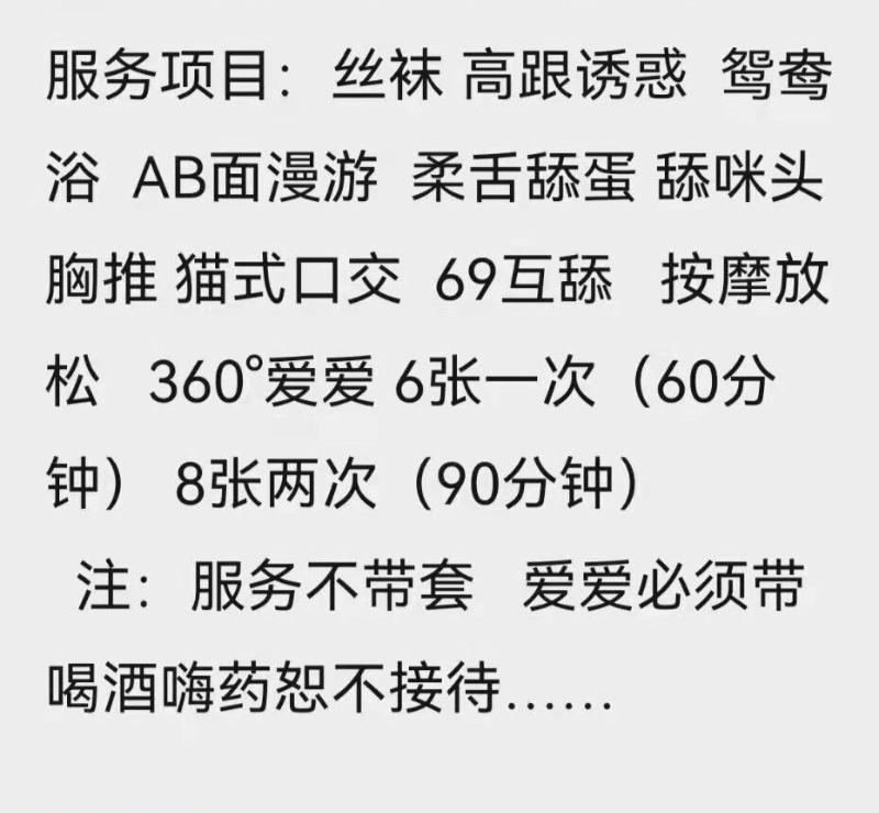 没有踩坑,二百块钱快餐太值得了,性价比真的很高。一进门的话就问喝不喝水,然后的话就去洗澡。我选的一个快餐又加一个套餐,套餐一起洗澡,帮你亲自去洗,洗了之后我们就躺到床上,然后后就进行胸推,漫游,特别是这个深喉,哎呀,太爽,,舔的全身都是酥酥麻麻的,太爽了。这个胸哈,是真有手感,。软软的。我是一个胸控,但是都没来得及及时间去摸。然后水也很多,很配合,不会敷衍了事。有兄弟们可以去试一下,性价比真的很高了。身材bbw。就是皮肤很滑,,不踩坑,兄弟们可以去冲,服务没得说,酥酥麻麻的,薇朩QQ加不上的,直接打电话联系老师,老师本人自己开课,靠谱