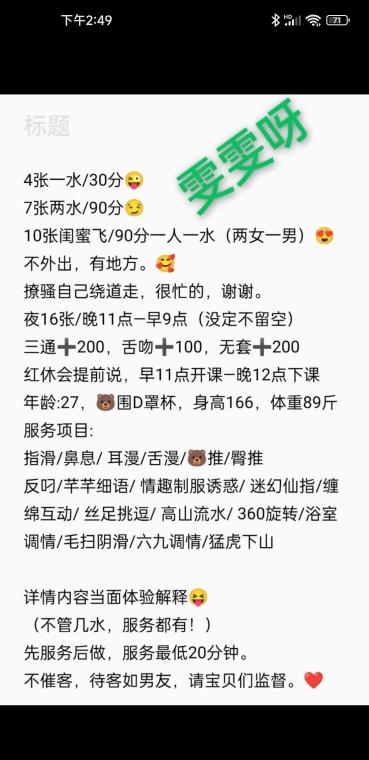 是个少妇,服务很多课表都有,可无套三通要加钱,有实力和胆大的可以试试,姐姐人很骚,很会调情,感兴趣的ly们可以去试试,价格便宜,对了她还有闺蜜可以双飞但要钱。