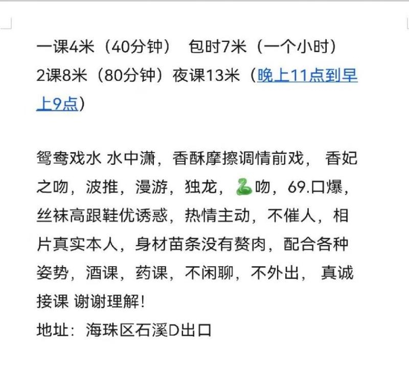 没有踩坑,二百块钱快餐太值得了,性价比真的很高。一进门的话就问喝不喝水,然后的话就去洗澡。我选的一个快餐又加一个套餐,套餐一起洗澡,帮你亲自去洗,洗了之后我们就躺到床上,然后后就进行胸推,漫游,特别是这个深喉,哎呀,太爽,,舔的全身都是酥酥麻麻的,太爽了。这个胸哈,是真有手感,。软软的。我是一个胸控,但是都没来得及及时间去摸。然后水也很多,很配合,不会敷衍了事。有兄弟们可以去试一下,性价比真的很高了。身材bbw。就是皮肤很滑,,不踩坑,兄弟们可以去冲,服务没得说,酥酥麻麻的,薇朩QQ加不上的,直接打电话联系老师,老师本人自己开课,靠谱
