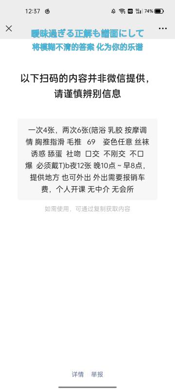 没有踩坑,二百块钱快餐太值得了,性价比真的很高。一进门的话就问喝不喝水,然后的话就去洗澡。我选的一个快餐又加一个套餐,套餐一起洗澡,帮你亲自去洗,洗了之后我们就躺到床上,然后后就进行胸推,漫游,特别是这个深喉,哎呀,太爽,,舔的全身都是酥酥麻麻的,太爽了。这个胸哈,是真有手感,。软软的。我是一个胸控,但是都没来得及及时间去摸。然后水也很多,很配合,不会敷衍了事。有兄弟们可以去试一下,性价比真的很高了。身材bbw。就是皮肤很滑,,不踩坑,兄弟们可以去冲,服务没得说,酥酥麻麻的,薇朩QQ加不上的,直接打电话联系老师,老师本人自己开课,靠谱