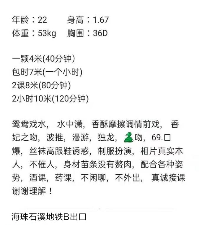 没有踩坑,二百块钱快餐太值得了,性价比真的很高。一进门的话就问喝不喝水,然后的话就去洗澡。我选的一个快餐又加一个套餐,套餐一起洗澡,帮你亲自去洗,洗了之后我们就躺到床上,然后后就进行胸推,漫游,特别是这个深喉,哎呀,太爽,,舔的全身都是酥酥麻麻的,太爽了。这个胸哈,是真有手感,。软软的。我是一个胸控,但是都没来得及及时间去摸。然后水也很多,很配合,不会敷衍了事。有兄弟们可以去试一下,性价比真的很高了。身材bbw。就是皮肤很滑,,不踩坑,兄弟们可以去冲,服务没得说,酥酥麻麻的,薇朩QQ加不上的,直接打电话联系老师,老师本人自己开课,靠谱