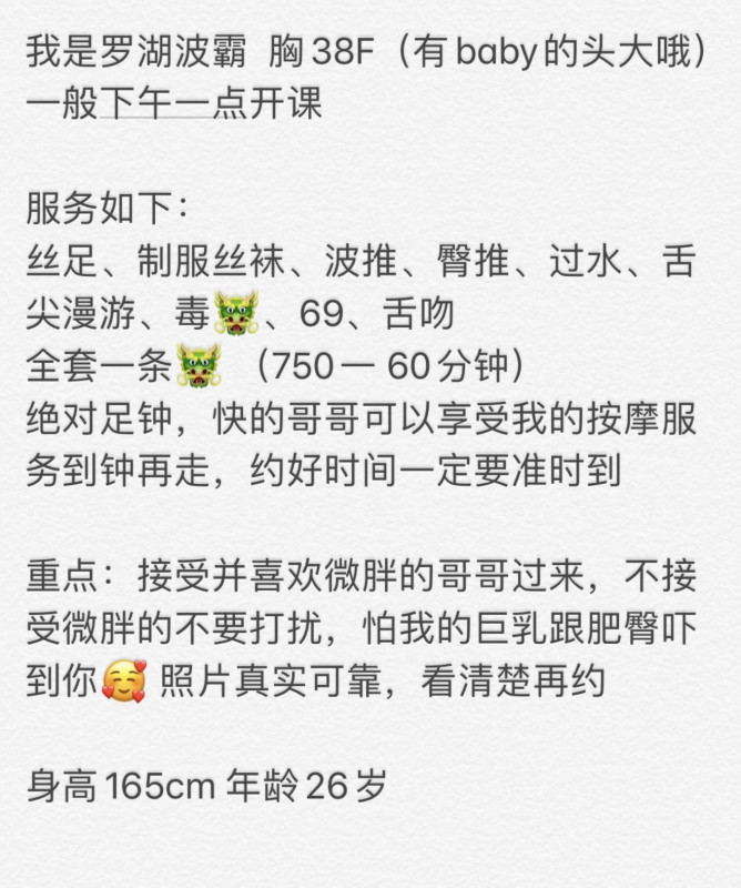 没有踩坑,二百块钱快餐太值得了,性价比真的很高。一进门的话就问喝不喝水,然后的话就去洗澡。我选的一个快餐又加一个套餐,套餐一起洗澡,帮你亲自去洗,洗了之后我们就躺到床上,然后后就进行胸推,漫游,特别是这个深喉,哎呀,太爽,,舔的全身都是酥酥麻麻的,太爽了。这个胸哈,是真有手感,。软软的。我是一个胸控,但是都没来得及及时间去摸。然后水也很多,很配合,不会敷衍了事。有兄弟们可以去试一下,性价比真的很高了。身材bbw。就是皮肤很滑,,不踩坑,兄弟们可以去冲,服务没得说,酥酥麻麻的,薇朩QQ加不上的,直接打电话联系老师,老师本人自己开课,靠谱
