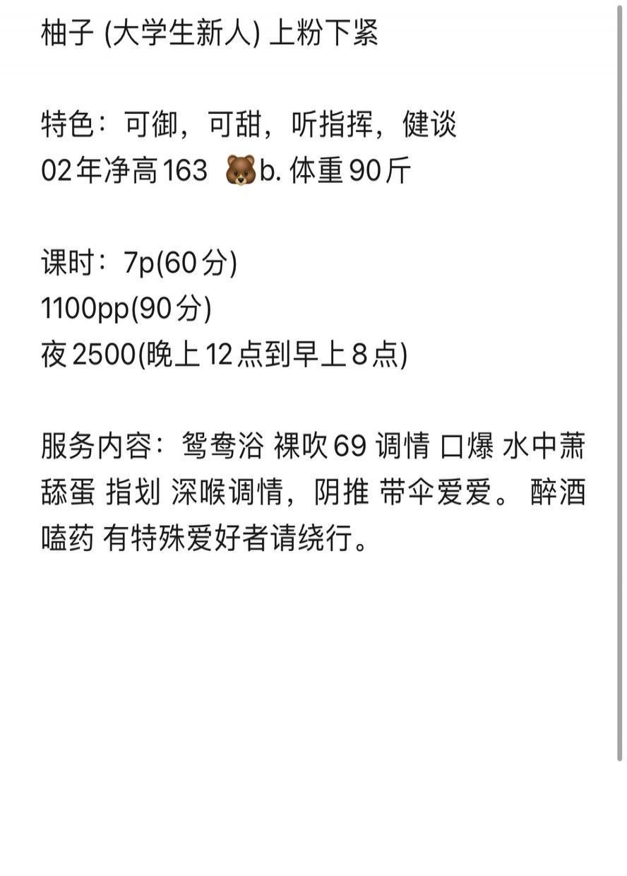 柚子是属于特别清纯可爱特别真实的小女友类型,如清水芙蓉一般,只可远观不可亵玩。去的时候刚从上一个老师那里出来,本来只是抱着试试的心态去看看的,结果去了才发现柚子不管是颜值,身材还是性格,真的撞到我心坎上了。洗澡的时候我还跟她说我刚做过,估计没状态了,一会儿坐会儿服务就好。口了一会儿她累了换女上,一下把我状态提起来了,起身压住冲锋。可能1P的时间确实有点短,我做的比较急,差不多20分钟没有出来,她受不了了,我就炫了一会儿小豆豆,没有异味,爱不释手,看着柚子疯狂扭动,有点轻微反抗的动作,身体也止不住得颤抖,这种成就感和快感不言而喻。最后炫完了又做了10多分钟,看她实在受不了了,还是放过她吧,完事后柚子一副受了委屈的小媳妇模样,太讨人喜欢了。总结,柚子是属于那种特别清纯可爱的类型,不是太过分的要求都会尽量配合,可能因为刚下海不久不太能抗,我都怕她以后不接我了,还是希望ly 们能温柔以待。
