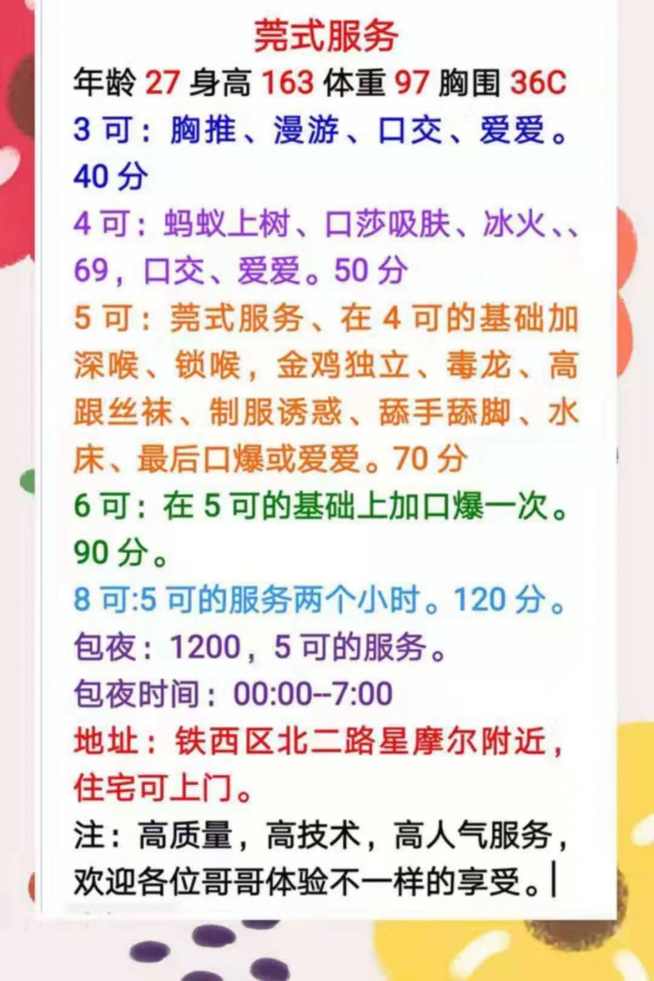 位置好找,停车方便,,姐姐长得到还可以,身材苗条,胸大,做活不机车,口活深喉做的比较舒服,会喷水,床上各种姿势也都很配合,这个是狼友推选给我的,真的不白来一趟,值得推选。