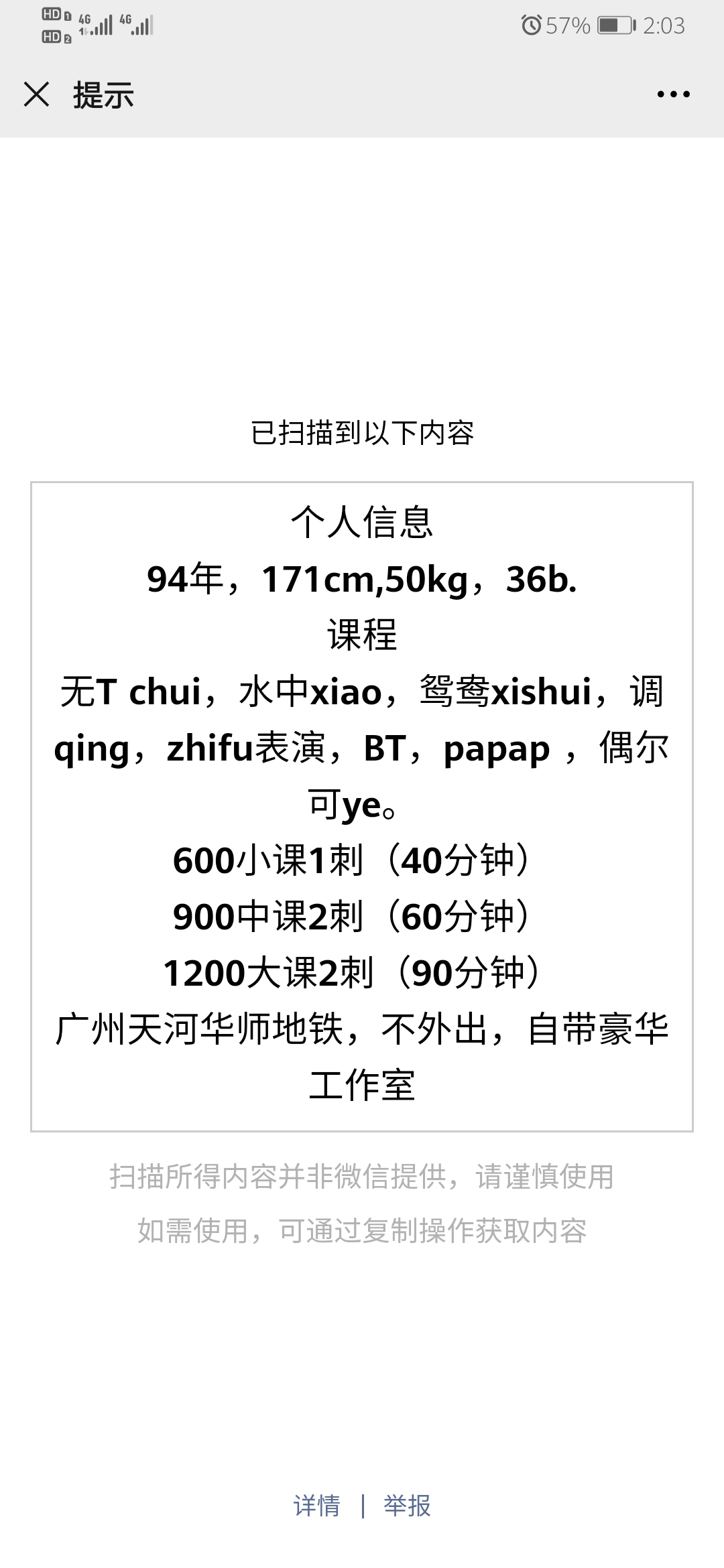 没有踩坑,二百块钱快餐太值得了,性价比真的很高。一进门的话就问喝不喝水,然后的话就去洗澡。我选的一个快餐又加一个套餐,套餐一起洗澡,帮你亲自去洗,洗了之后我们就躺到床上,然后后就进行胸推,漫游,特别是这个深喉,哎呀,太爽,,舔的全身都是酥酥麻麻的,太爽了。这个胸哈,是真有手感,。软软的。我是一个胸控,但是都没来得及及时间去摸。然后水也很多,很配合,不会敷衍了事。有兄弟们可以去试一下,性价比真的很高了。身材bbw。就是皮肤很滑,,不踩坑,兄弟们可以去冲,服务没得说,酥酥麻麻的,薇朩QQ加不上的,直接打电话联系老师,老师本人自己开课,靠谱