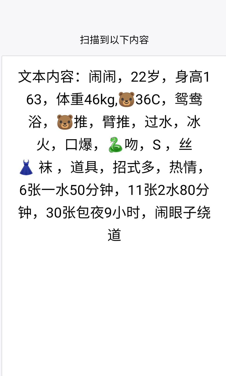 没有踩坑,二百块钱快餐太值得了,性价比真的很高。一进门的话就问喝不喝水,然后的话就去洗澡。我选的一个快餐又加一个套餐,套餐一起洗澡,帮你亲自去洗,洗了之后我们就躺到床上,然后后就进行胸推,漫游,特别是这个深喉,哎呀,太爽,,舔的全身都是酥酥麻麻的,太爽了。这个胸哈,是真有手感,。软软的。我是一个胸控,但是都没来得及及时间去摸。然后水也很多,很配合,不会敷衍了事。有兄弟们可以去试一下,性价比真的很高了。身材bbw。就是皮肤很滑,,不踩坑,兄弟们可以去冲,服务没得说,酥酥麻麻的,薇朩QQ加不上的,直接打电话联系老师,老师本人自己开课,靠谱