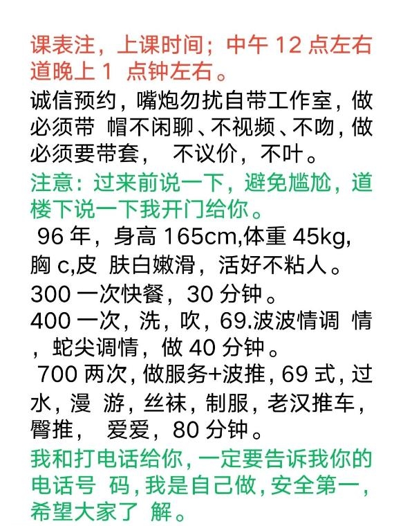 没有踩坑,二百块钱快餐太值得了,性价比真的很高。一进门的话就问喝不喝水,然后的话就去洗澡。我选的一个快餐又加一个套餐,套餐一起洗澡,帮你亲自去洗,洗了之后我们就躺到床上,然后后就进行胸推,漫游,特别是这个深喉,哎呀,太爽,,舔的全身都是酥酥麻麻的,太爽了。这个胸哈,是真有手感,。软软的。我是一个胸控,但是都没来得及及时间去摸。然后水也很多,很配合,不会敷衍了事。有兄弟们可以去试一下,性价比真的很高了。身材bbw。就是皮肤很滑,,不踩坑,兄弟们可以去冲,服务没得说,酥酥麻麻的,薇朩QQ加不上的,直接打电话联系老师,老师本人自己开课,靠谱