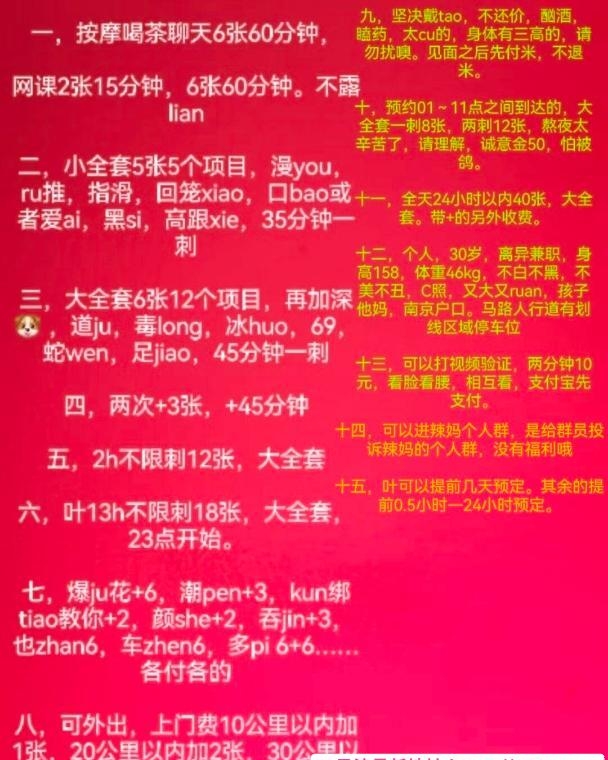 没有踩坑,二百块钱快餐太值得了,性价比真的很高。一进门的话就问喝不喝水,然后的话就去洗澡。我选的一个快餐又加一个套餐,套餐一起洗澡,帮你亲自去洗,洗了之后我们就躺到床上,然后后就进行胸推,漫游,特别是这个深喉,哎呀,太爽,,舔的全身都是酥酥麻麻的,太爽了。这个胸哈,是真有手感,。软软的。我是一个胸控,但是都没来得及及时间去摸。然后水也很多,很配合,不会敷衍了事。有兄弟们可以去试一下,性价比真的很高了。身材bbw。就是皮肤很滑,,不踩坑,兄弟们可以去冲,服务没得说,酥酥麻麻的,薇朩QQ加不上的,直接打电话联系老师,老师本人自己开课,靠谱