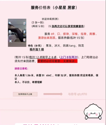 没有踩坑,二百块钱快餐太值得了,性价比真的很高。一进门的话就问喝不喝水,然后的话就去洗澡。我选的一个快餐又加一个套餐,套餐一起洗澡,帮你亲自去洗,洗了之后我们就躺到床上,然后后就进行胸推,漫游,特别是这个深喉,哎呀,太爽,,舔的全身都是酥酥麻麻的,太爽了。这个胸哈,是真有手感,。软软的。我是一个胸控,但是都没来得及及时间去摸。然后水也很多,很配合,不会敷衍了事。有兄弟们可以去试一下,性价比真的很高了。身材bbw。就是皮肤很滑,,不踩坑,兄弟们可以去冲,服务没得说,酥酥麻麻的,薇朩QQ加不上的,直接打电话联系老师,老师本人自己开课,靠谱