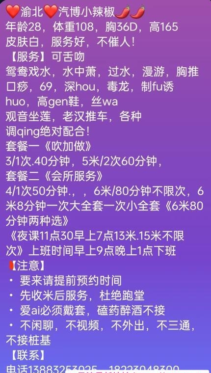 没有踩坑,二百块钱快餐太值得了,性价比真的很高。一进门的话就问喝不喝水,然后的话就去洗澡。我选的一个快餐又加一个套餐,套餐一起洗澡,帮你亲自去洗,洗了之后我们就躺到床上,然后后就进行胸推,漫游,特别是这个深喉,哎呀,太爽,,舔的全身都是酥酥麻麻的,太爽了。这个胸哈,是真有手感,。软软的。我是一个胸控,但是都没来得及及时间去摸。然后水也很多,很配合,不会敷衍了事。有兄弟们可以去试一下,性价比真的很高了。身材bbw。就是皮肤很滑,,不踩坑,兄弟们可以去冲,服务没得说,酥酥麻麻的,薇朩QQ加不上的,直接打电话联系老师,老师本人自己开课,靠谱